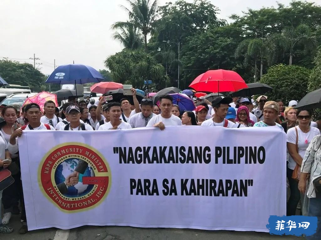 KAPA支持者拉横幅游行:菲律宾人民团结起来,为了摆脱贫困