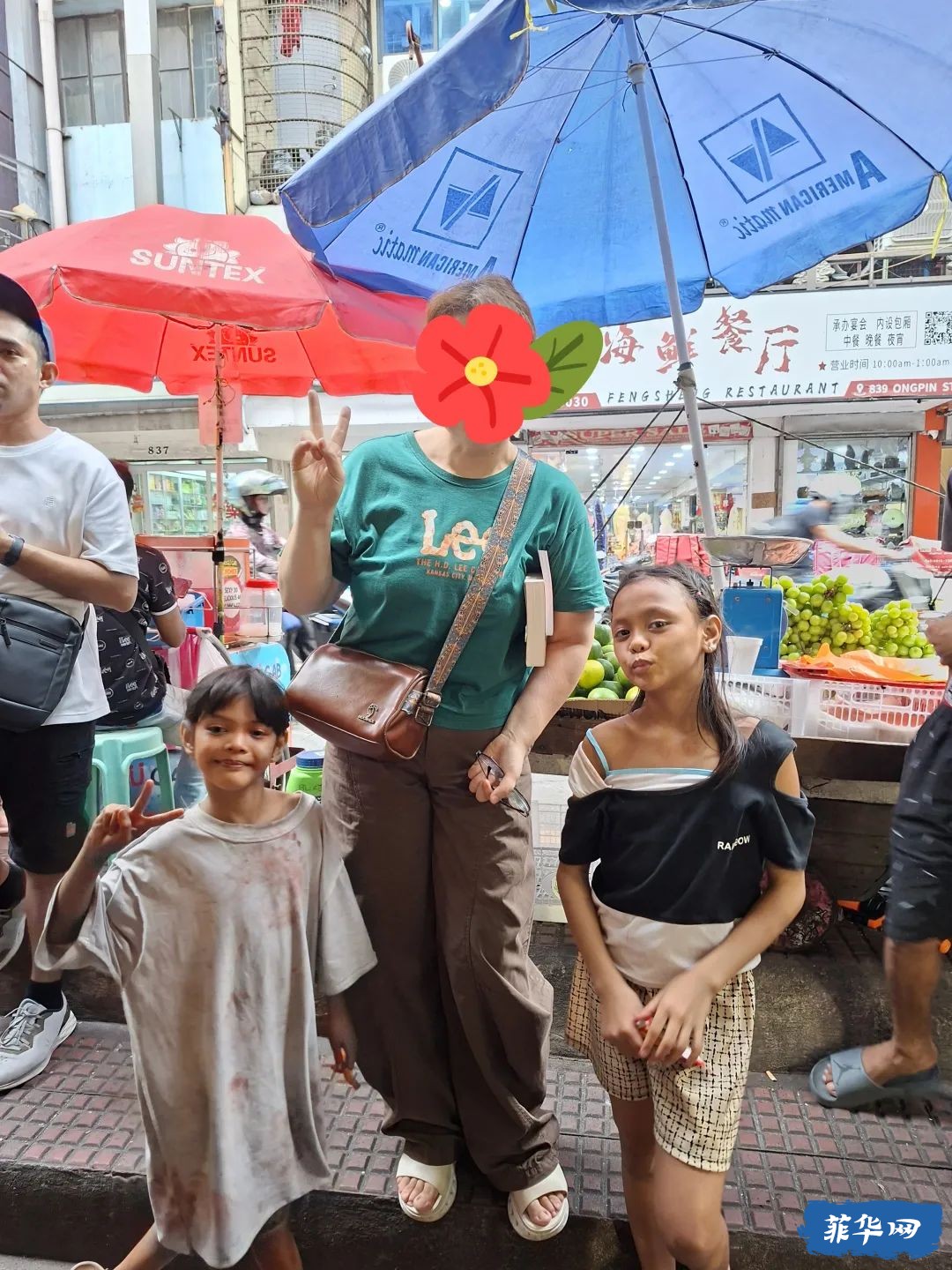 在买油条的时候,几个菲律宾小孩子缠上了高老师,向她要钱,高老师毫不犹豫地就给了。后来又有一个小孩走到我跟前向我要钱,我也摸了几个硬币给她。高老师甚至还和小女孩攀谈起来了。我趁机给她们拍了张合影。