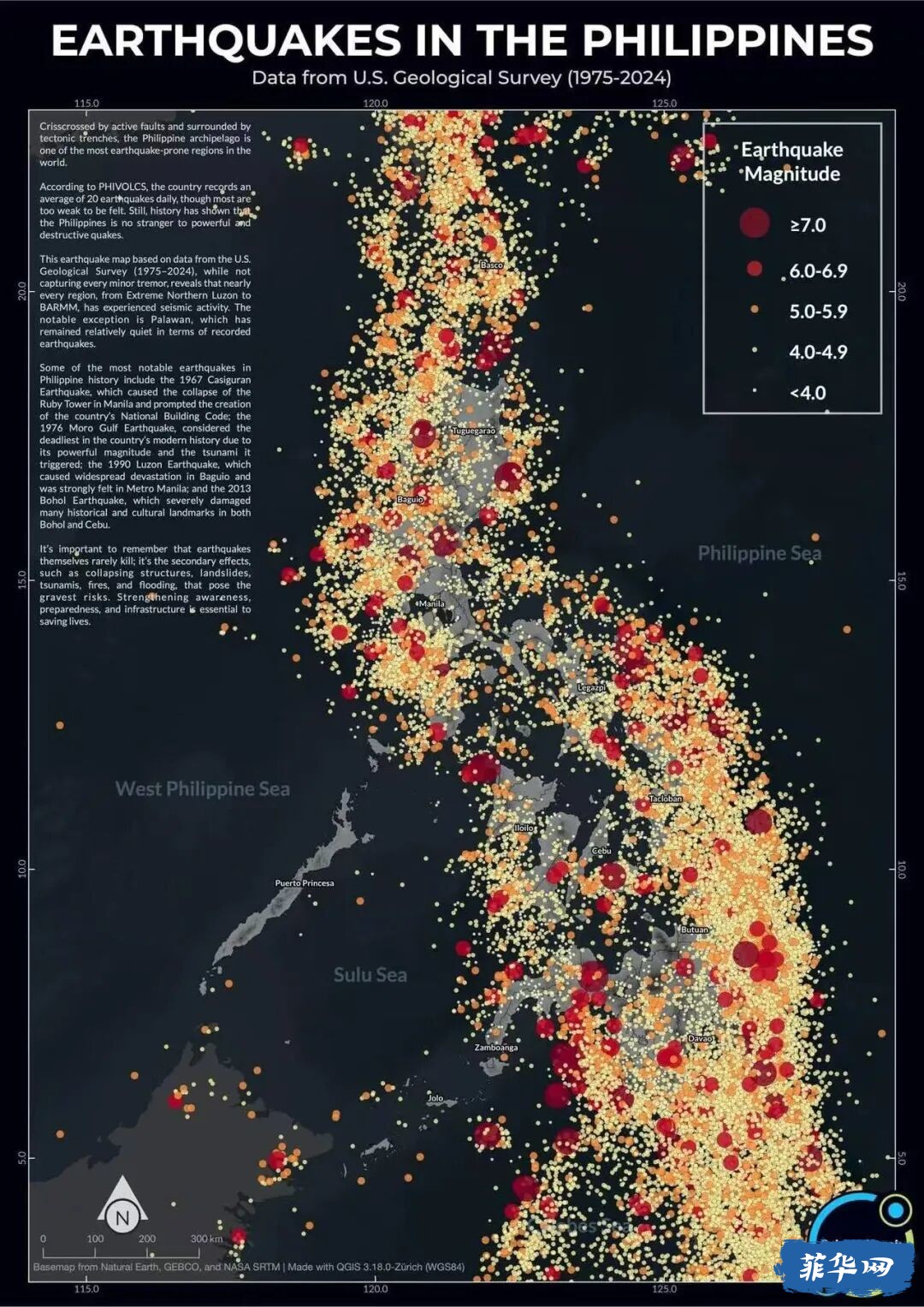 除了新闻上了解了一下昨晚地震的情况 菲律宾的地震频道也科普了一下菲律宾地震的频率 果然在地震带上每年都要被迫友情参与一下地震体验~ 超过7级的次数还真不在少数~ 整个图有点儿像几颗红豆掉小米堆儿里了~