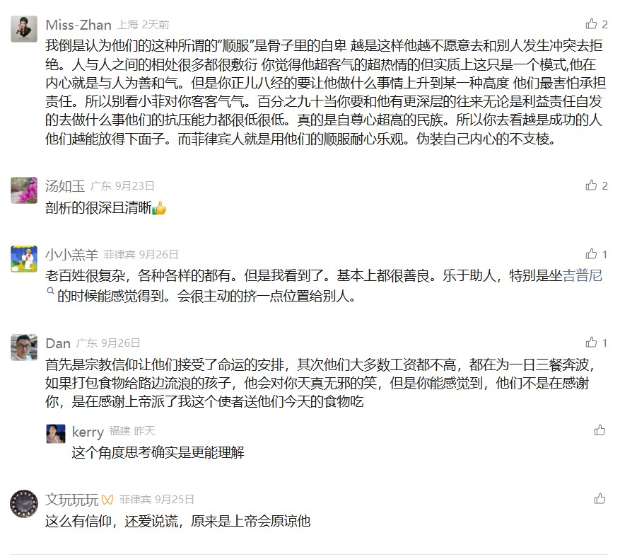 作为中国人,我们觉得不可思议,且难以认同。但或许,正是这种顺服,让菲律宾人在多灾多难的环境里保持了某种温和与乐观。那种随风摇曳的姿态,不是我们熟悉的“骨气”,却也自有其独特的土壤。