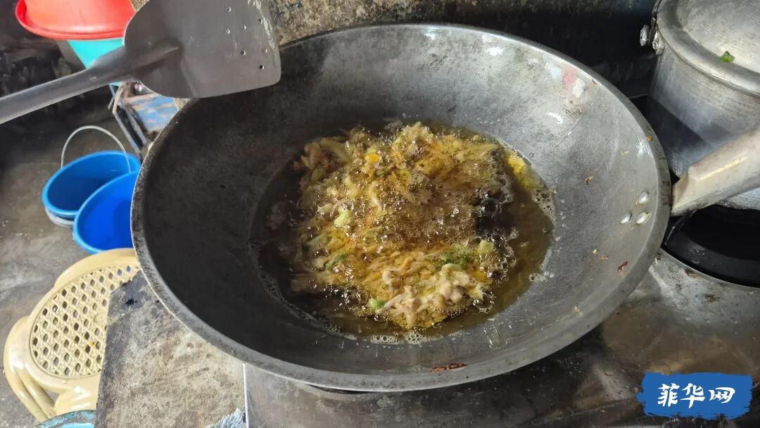 老房东招呼我在她旁边坐下,然后就把一大盆炸物推给我。她边叫工人去取饮料,边递给我一个盘子,说:少年仔,你来得正好,赶紧吃,都是刚炸的。她老伴挤了点番茄酱到盘子上,热情地介绍:沾这个吃,很好吃。然后他很快收拾起自己的盘子,就向院子走去了。他家是女主内,每次他都识趣走开,让我们自己聊。我刚吃完饭,可老房东一个劲地招呼,雪碧也倒上了,气氛都到这了,再不吃就不礼貌了。这是类似炸海蛎的蔬菜炸,有包菜,胡萝卜,佛手瓜等蔬菜,混合面粉炸制的。你还别说,味道确实不错,酥脆清甜,我不知不觉就吃了3个,雪碧也喝了两杯。
