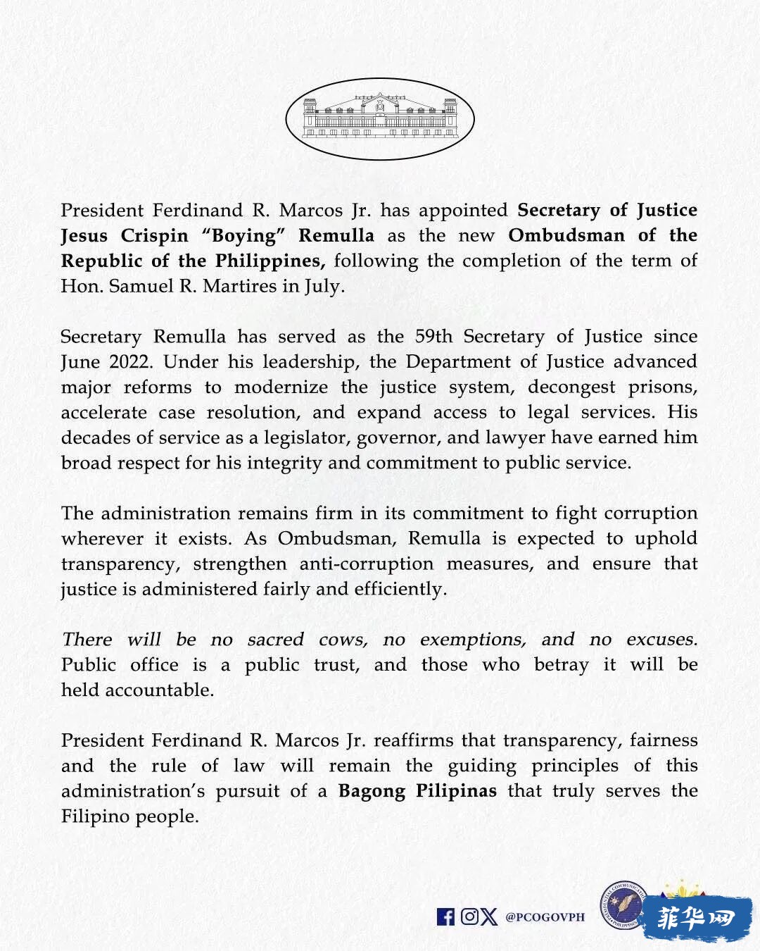 今天(2025年10月7日),小马科斯任命其重要盟友、司法部长博英·雷穆拉(Department of Justice Secretary Boying Remulla)成为下一任监察员(Ombudsman)。雷穆拉将接替任期于7月27日到期的前监察员塞缪尔·马蒂雷斯(Samuel Martires)。他的任期为七年,不得连任。