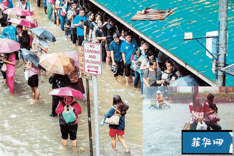 8月22日,大马尼拉通勤者在被水淹没的轻轨站路段排队。插图显示停课后,学生们在塔夫脱大道沿线的倾盆大雨中休息。
