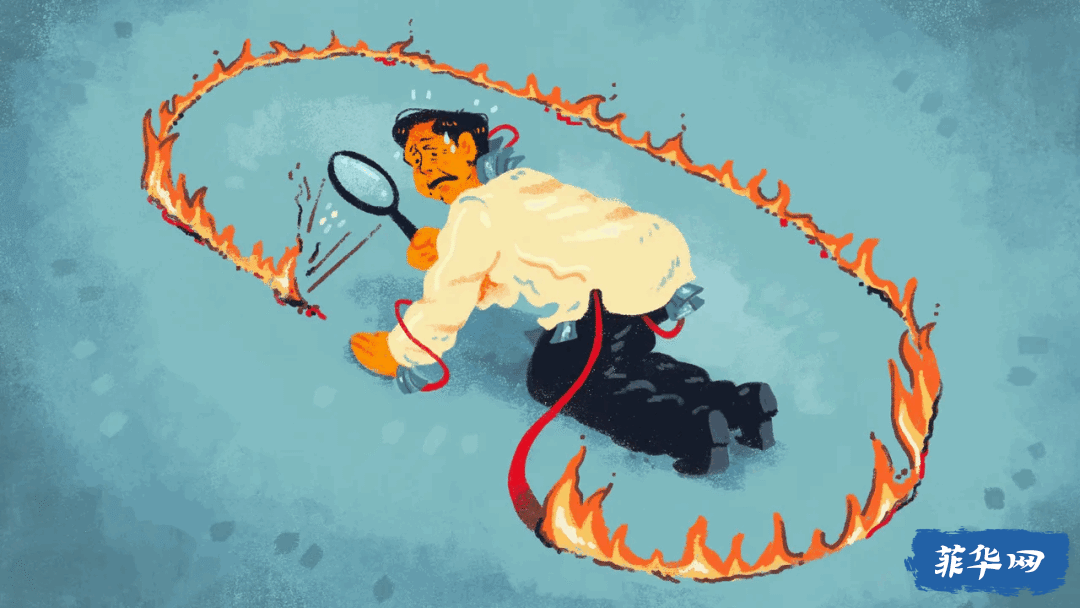 讽刺小马科斯装腔作势查办防洪工程反而引火烧身的漫画
