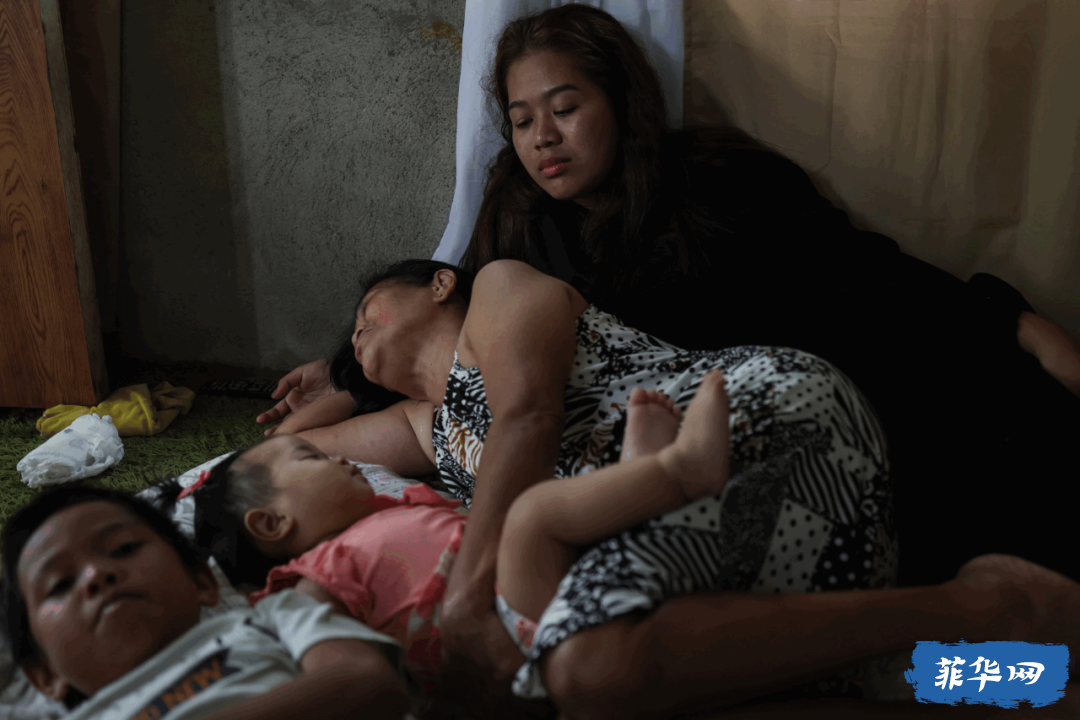 2025年3月16日,在菲律宾吕宋岛伊罗辛的家中,杜哈帕与母亲黛西、7个月大的女儿奎因以及其他亲属在客厅地板上休息。