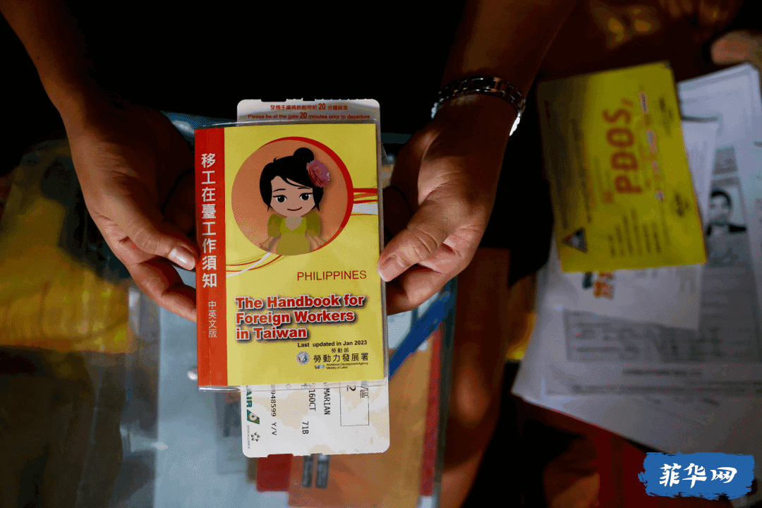 2024年7月18日,在台湾新北市,杜哈帕手持一本《移工在台工作须知》和她首次出国来台湾的机票。