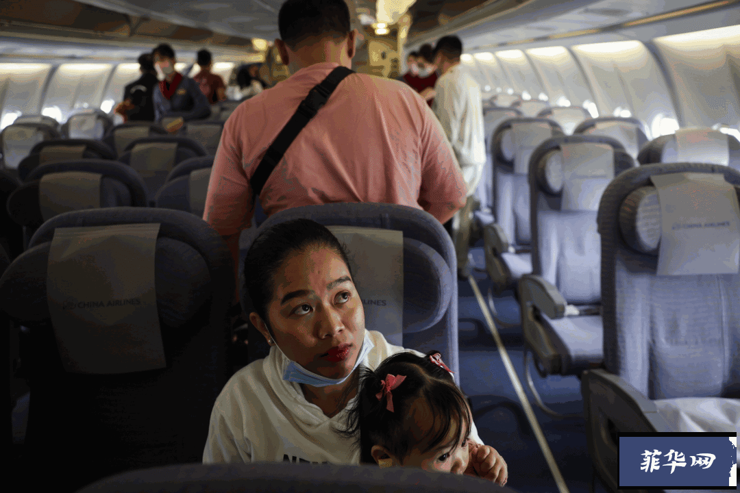 2025年3月10日,在台湾桃园机场,杜哈帕抱着她7个月大的女儿奎因坐在飞机上,准备从台湾飞往菲律宾。