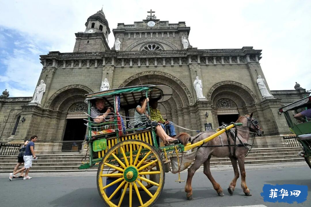 乘坐马车的游客经过马尼拉王城区马尼拉大教堂(Manila Cathedral in Intramuros)