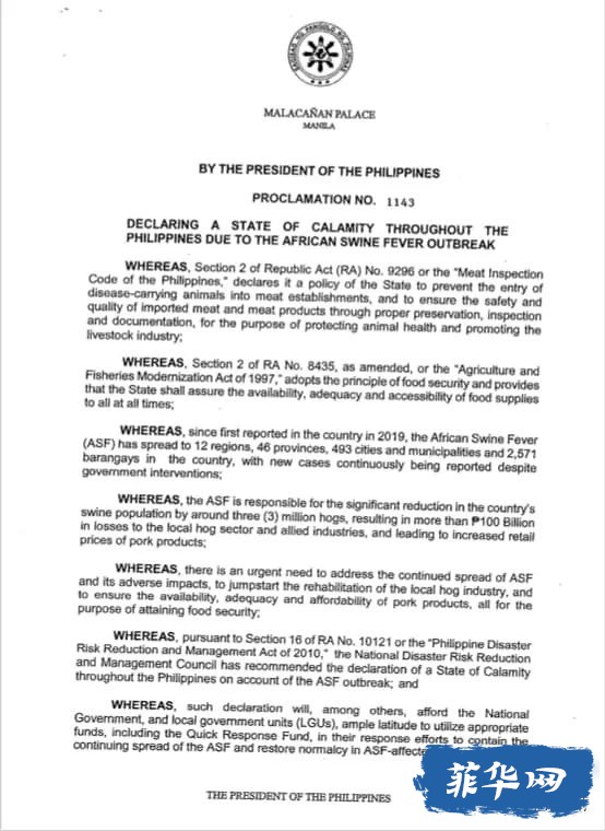 杜特尔特在周一签署的声明中说:“自此日起,由于ASF疫情,整个菲律宾宣布为灾难状态,除非根据情况需要提早解除或延长,”