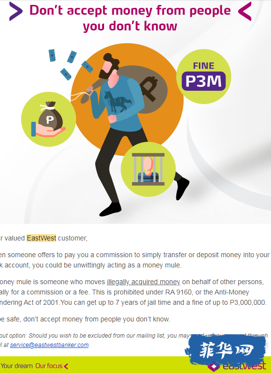 另一方面,包括BDO,BPI,EASTWEST等知名银行在内的菲律宾多家银行,纷纷给自己的客户发邮件,提示用户不要和他人出借/租赁自己的银行账户,更不要用自己的银行账户,从不认识的人那里,接受款项。