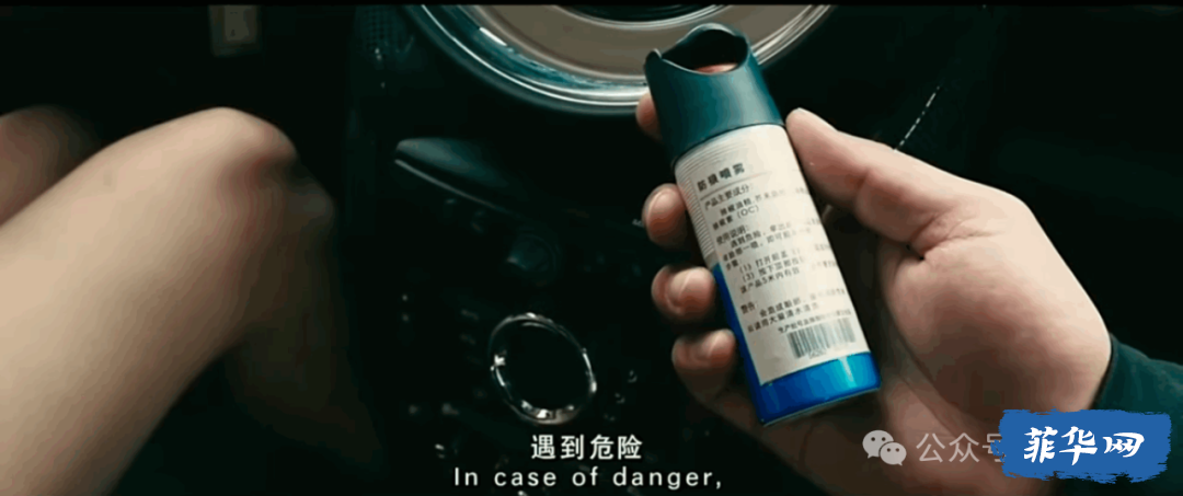 电影《心花怒放》中的防狼喷雾使用说明:遇到危险,拿出此产品,正面面对袭击者脸部一喷,即可脱离危险!