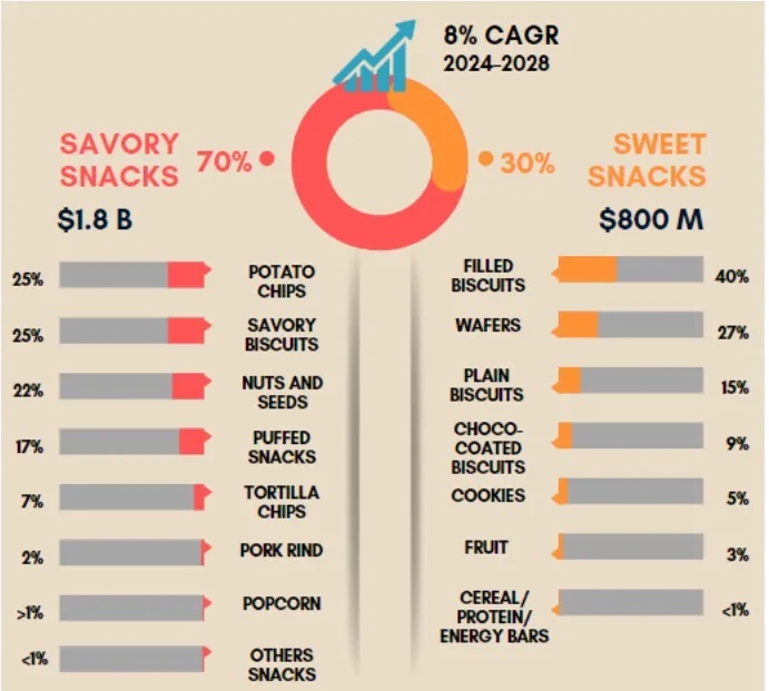 市场价值与增长: 2023年,包括本地和进口产品在内的菲律宾零食市场的零售价值估计为26亿美元。其中,咸味零食占市场总销售额的70%,销量超过甜味零食。预计到2028年,该市场将以每年8%的复合年增长率增长,这一增长率是亚太地区平均水平的两倍。