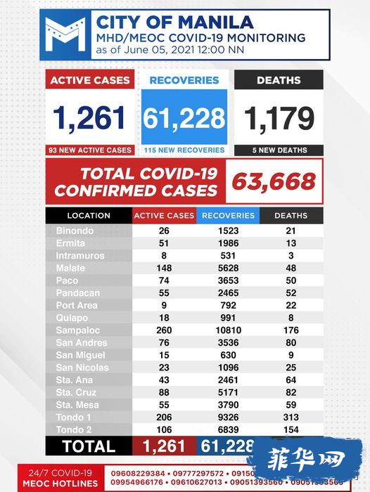 截止时间6月5日中午12:00NN,马尼拉市卫生局(MHD)通报,当天,马尼拉市新增93例“新型冠状病毒”肺炎COVID-19确诊病例,增加死亡5例,115例治愈病例。截至目前,马尼拉市累计63,668例确诊,其中死亡1,179例,目前在医院或家庭隔离措施中接受治疗的患者1,261例,康复61,228例。华人区泯伦洛(Binondo)今天新增4例“新型冠状病毒”肺炎COVID-19确诊病例,增加死亡0例,5例治愈病例。截至目前,华人区泯伦洛(Binondo)累计1,570例确诊,其中死亡21例,目前在医院或家庭隔离措施中接受治疗的患者26例,康复1,523例。