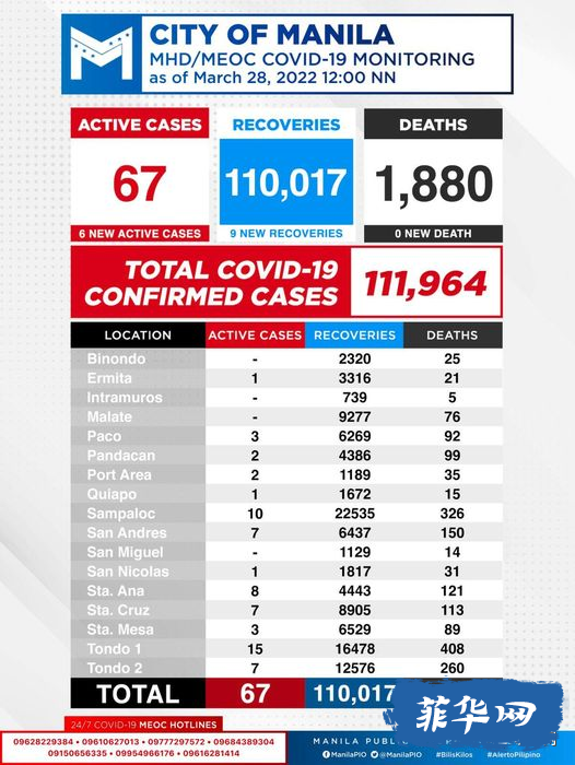 截止时间2022年3月28日中午12:00NN,马尼拉市卫生局(MHD)通报,当天,马尼拉市新增6例“新型冠状病毒”肺炎COVID-19确诊病例,新增死亡0例,9例治愈病例。截至目前,马尼拉市累计111,964例确诊,其中死亡1,880例,目前在医院或家庭隔离措施中接受治疗的患者67例,康复110,017例。清零!华人区泯伦洛(Binondo)当日新增0例“新型冠状病毒”肺炎COVID-19确诊病例,增加死亡0例,1治愈病例。截至目前,华人区泯伦洛(Binondo)累计确诊2,345例,其中死亡25例,0例在医院或家庭隔离措施中接受治疗的患者,康复2,320例。