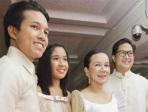 格丽丝•傅(左三)今日宣布角逐下届总统,菲律宾选民详细了解到她的儿子布里安丶女儿汉娜丶丈夫尼尔,夫妻俩还有另外一个女儿叫尼卡。